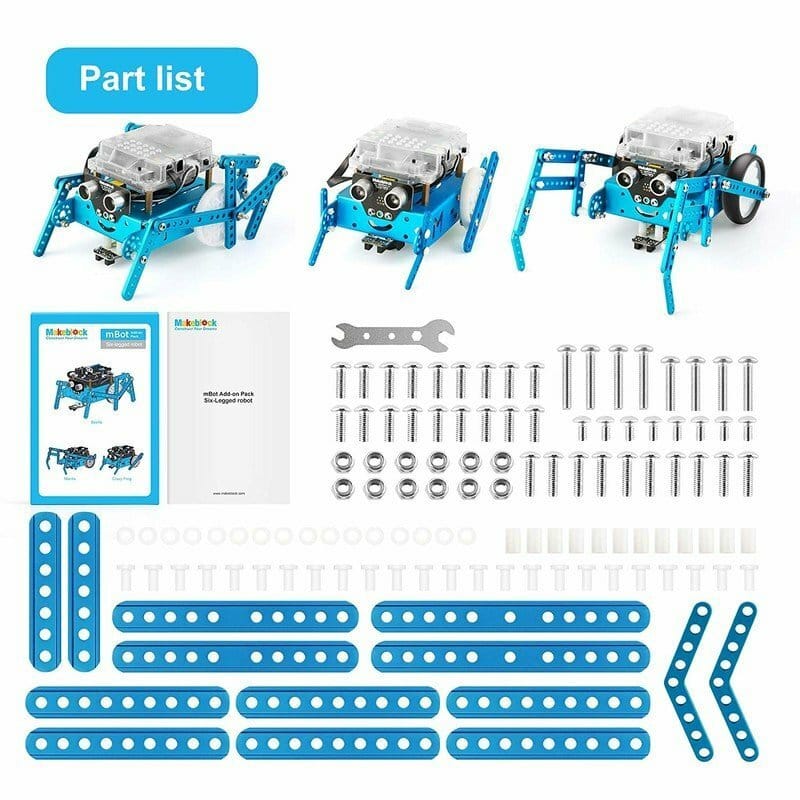 mBot Add-On Pack – Six-Legged Robot เป็นชุด อุปกรณ์เสริม (Expansion Pack) สำหรับ mBot ช่วยเปลี่ยนหุ่นยนต์ล้อธรรมดาให้กลายเป็นหุ่นยนต์ หกขา ซึ่งสามารถประกอบได้ในหลายรูปแบบสร้างสรรค์ ✨ เช่น ด้วง (Beetle), ตั๊กแตน (Mantis) และ กบบ้า (Crazy Frog) โดยใช้ขาอลูมิเนียมแทนล้อเดิมของ mBot