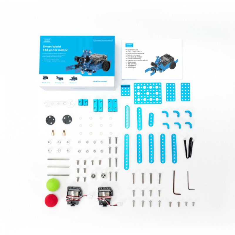 Smart World Add-on Pack สำหรับ mBot2 เป็น ชุดส่วนเสริม (add-on) ที่ใช้ร่วมกับ หุ่นยนต์ Makeblock mBot2 เพื่อให้สามารถสร้างแบบจำลองหุ่นยนต์รูปแบบใหม่ ๆ และทำกิจกรรมโครงงานที่เกี่ยวข้องกับแนวคิด Smart World / โลกอัจฉริยะ เช่น Smart Farm, Smart City, โลจิสติกส์ ฯลฯ โดยเพิ่มโครงสร้างและมอเตอร์ให้ mBot2 ทำงานได้หลากหลายกว่าเดิม (mBot2 ต้องมีแยกต่างหาก)